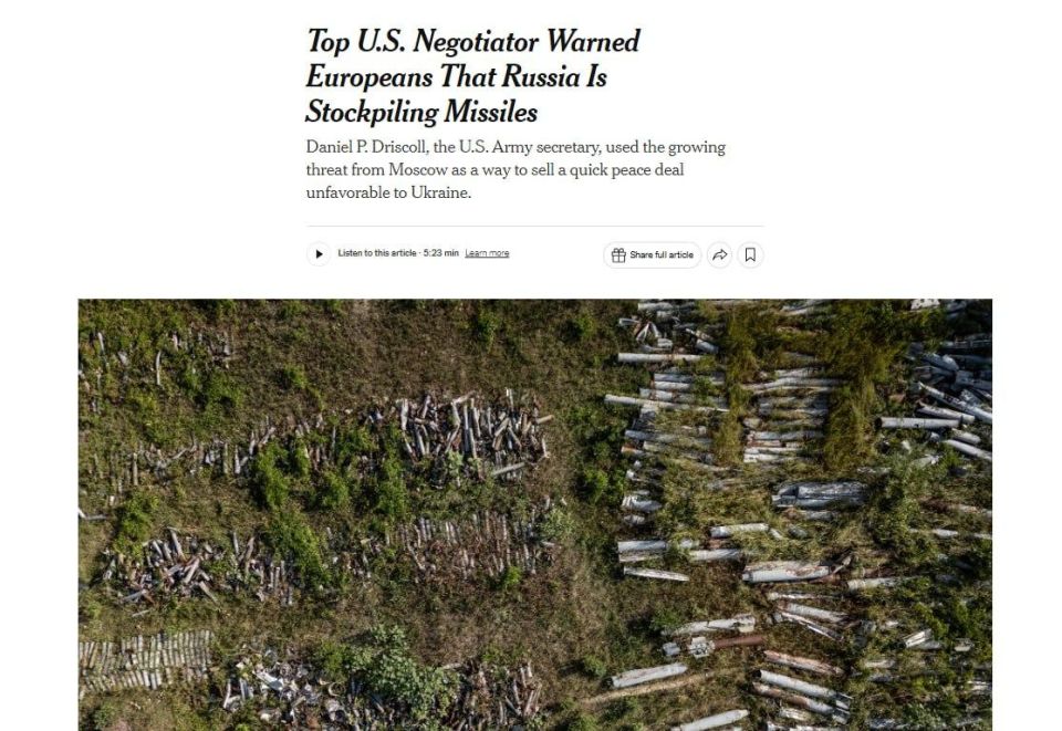 Министр армии США Дэн Дрисколл на закрытой встрече в Киеве предупредил европейских дипломатов: Россия не только регулярно наносит удары по Украине, но и накапливает ракеты быстрее, чем успевает их запускать.New York Times пишет, что Дрисколл...