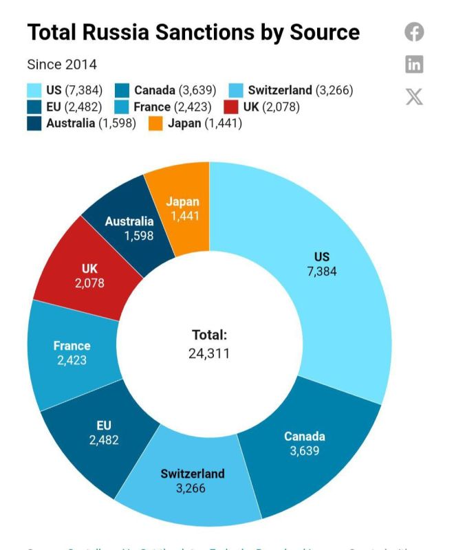 США остаются лидером по числу антироссийских мер: на их долю приходится 30,4% всех ограничений, или 7 384 санкции. Далее следуют: Канада — 3 639 (15%), Швейцария — 3 266 (13,4%) и Франция — 2 423 (10%), сообщает канал «СОЛОВЬЕВ».