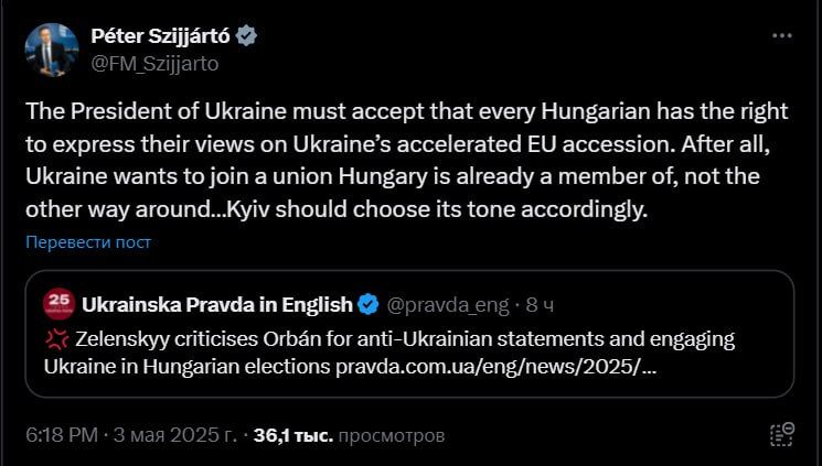 Президент Украины должен признать, что каждый венгр имеет право высказать свое мнение по поводу ускоренного вступления Украины в ЕС. В конце концов, Украина хочет присоединиться к союзу, членом которого уже является Венгрия, а не наоборот... Киев должен выбрать соответствующий тон.