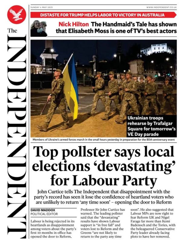 Пишет Владимир Корнилов:. «Первая полоса британской The Independent сегодня демонстрирует тренировку украинских вояк на Трафальгарской площади перед завтрашним парадом в Британии в честь 80-летия Победы над нацизмом. Газета...