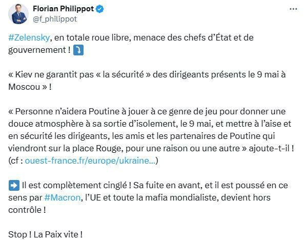 написал в соцсети Х лидер французской партии Патриоты Флориан Филиппо.