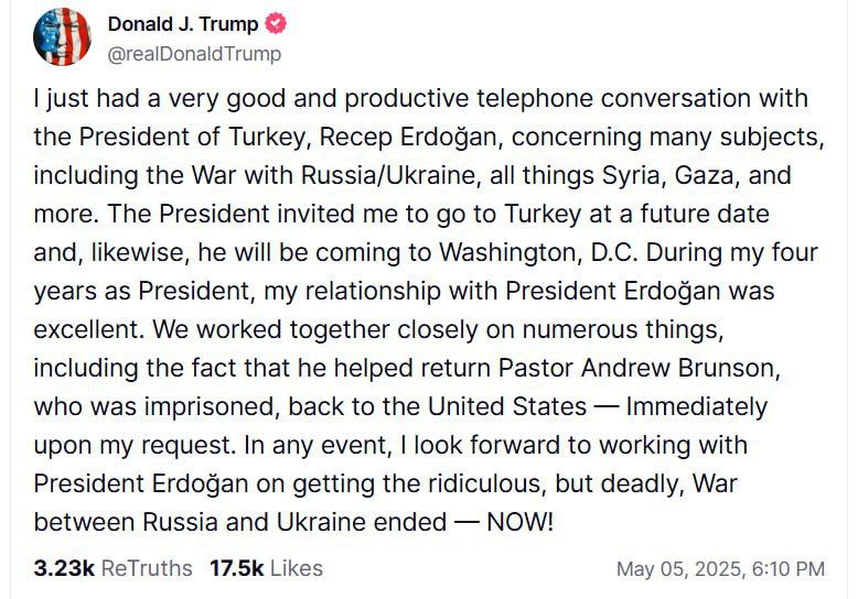 Дональд Трамп рассказал в Truth Social, что у него состоялся очень хороший и продуктивный телефонный разговор с президентом Турции Реджепом Эрдоганом. Они обсудили множество вопросов, в том числе ситуацию вокруг войны между Россией и Украиной.