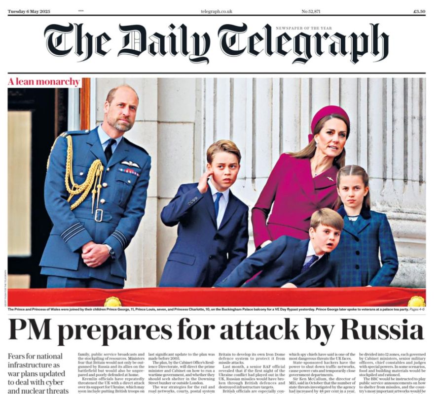 Сегодня первые полосы всех британских газет - о вчерашнем параде на Трафальгарской площади в честь 80-летия Победы. Но оригинальнее всех это преподносит The Daily Telegraph, сопроводившая парадное фото королевских отпрысков заголовком: Премьер-министр готовится к атаке России.