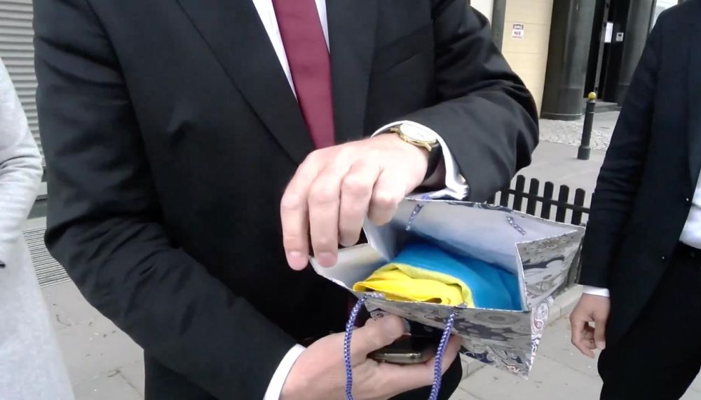 Наслушавшись критики мейнстримных политиков и прессы, Браун устроил вчера церемонию передачи снятого им флага в посольство Украины в Варшаве. Звонил, стучал, просил кого-то выйти. Но украинские дипломаты струсили и не вышли забрать свой флаг. В итоге кандидат в президенты приклеил скотчем пакет с сине-желтой тряпочкой на двери посольства.