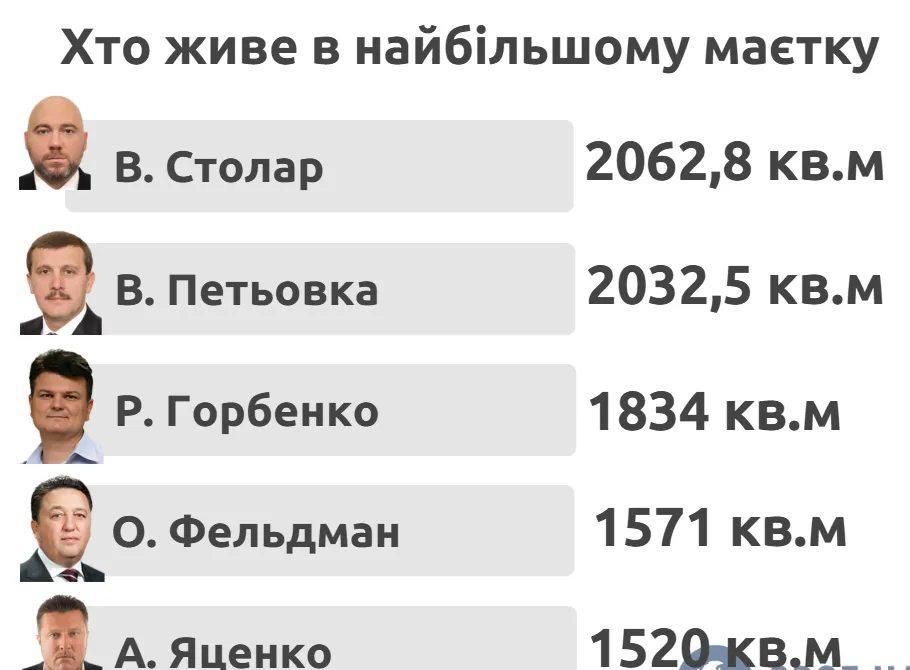 12 парламентариев задекларировали поместья площадью свыше 1000 квадратов. Лидирует Вадим Столар депутат от ОПЗЖ, владеющий домом на 2062 м в элитном Козине в Киевской области. Дом оформлен на бывшую супругу, но живёт в нем сам депутат с детьми и, судя по всему, с немалым штатом обслуживающего персонала.