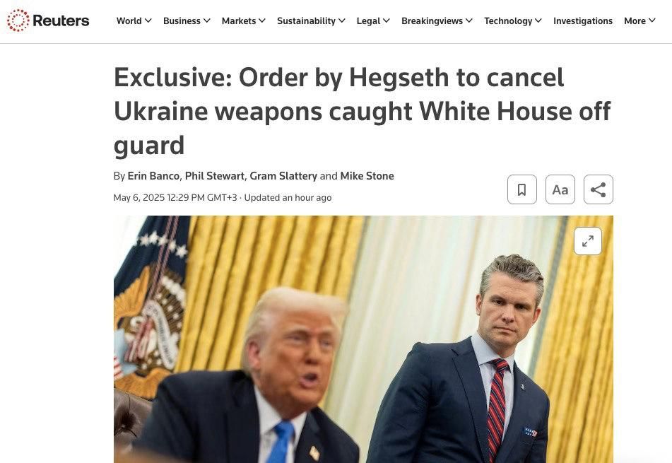 Эксклюзив: Приказ Хегсета об отмене поставок оружия Украине вызвал замешательство в Белом доме. Трамп не давал никаких указаний прекратить помощь Украине, пишет Reuters.