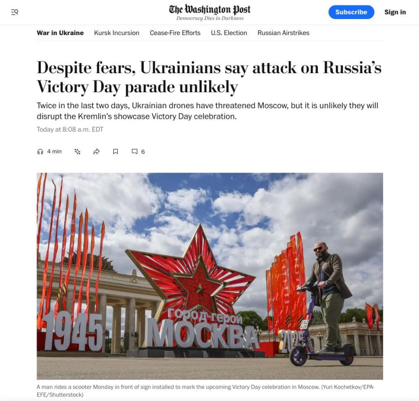 Украинский удар по Москве на 9 мая может разозлить Вашингтон, разговоры о возможной атаке – "шумиха", — The Washington Post со ссылкой на источник в Минобороны Украины