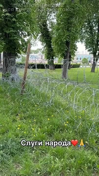 Здание украинского парламента окружено колючей проволокой высотой около 1,5 метров.