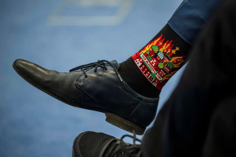 Спецпредставитель правительства Чехии по реконструкции Украины Томаш Копечный демонстрирует свои носки с горящим Кремлем