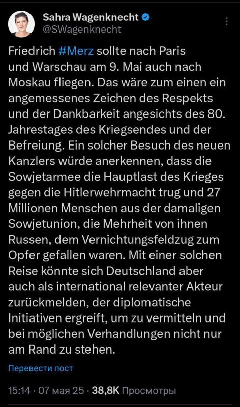 «После Парижа и Варшавы Фридрих Мерц должен прилететь в Москву 9 мая. Это было бы уместным знаком уважения и благодарности в связи с 80-й годовщиной окончания войны и освобождения. Такой визит нового канцлера стал бы признанием того, что советская армия приняла на себя основную тяжесть войны против гитлеровских вооруженных сил, и что 27 миллионов человек из бывшего Советского Союза, большинство из которых были русскими, стали жертвами кампании по уничтожению. Однако такая поездка позволила бы Германии вновь заявить о себе как о значимом международном игроке, который выступает с дипломатическими инициативами в качестве посредника, а не просто стоит в стороне от возможных переговоров».