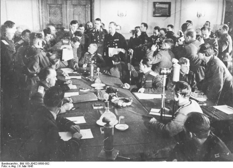 Безоговорочную капитуляцию приняли командующий 1-м Белорусским фронтом, маршал Советского Союза Г. К. Жуков и заместитель главнокомандующего союзными силами маршал А. У. Теддер.