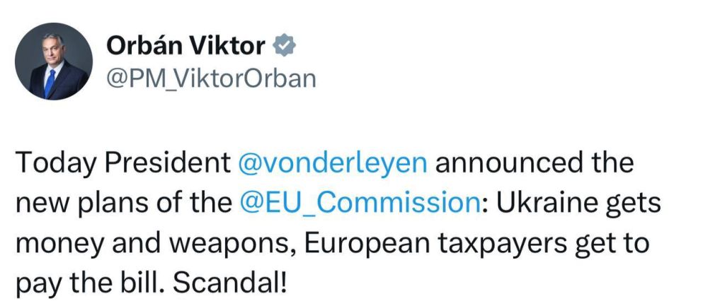 Роман Насонов: Премьер Венгрии Орбан:. Сегодня Урсула фон дер Ляйен объявила о новых планах Европейской комиссии: Украина получает деньги и оружие, европейские налогоплательщики платят по счетам
