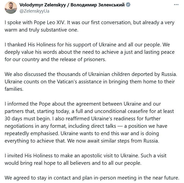 С сегодняшнего дня должно начаться полное и безоговорочное прекращение огня на срок не менее 30 дней. Я также подтвердил готовность Украины к дальнейшим переговорам в любом формате, включая прямые переговоры позицию, которую мы неоднократно подчеркивали. Украина хочет прекратить эту войну и делает все для этого. Теперь мы ждем аналогичных шагов от России.