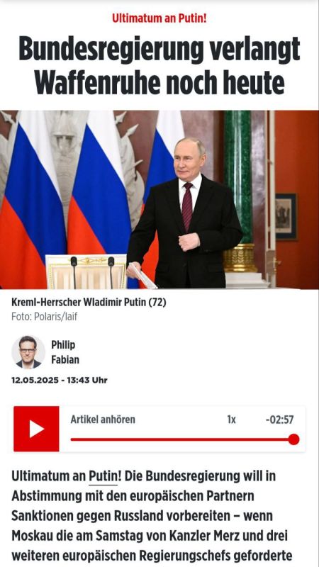Ультиматум Путину! Правительство Германии в координации со своими европейскими партнёрами намерено подготовить санкции против России, если Москва не выполнит 30-дневное прекращение огня на Украине, к которому в субботу призвали канцлер Мерц и три других главы европейских правительств.Если прекращение огня не будет достигнуто к понедельнику, будет «начата подготовка к санкциям», — заявил в полдень в Берлине представитель правительства Стефан Корнелиус. «Часы тикают — до конца дня осталось двенадцать часов».