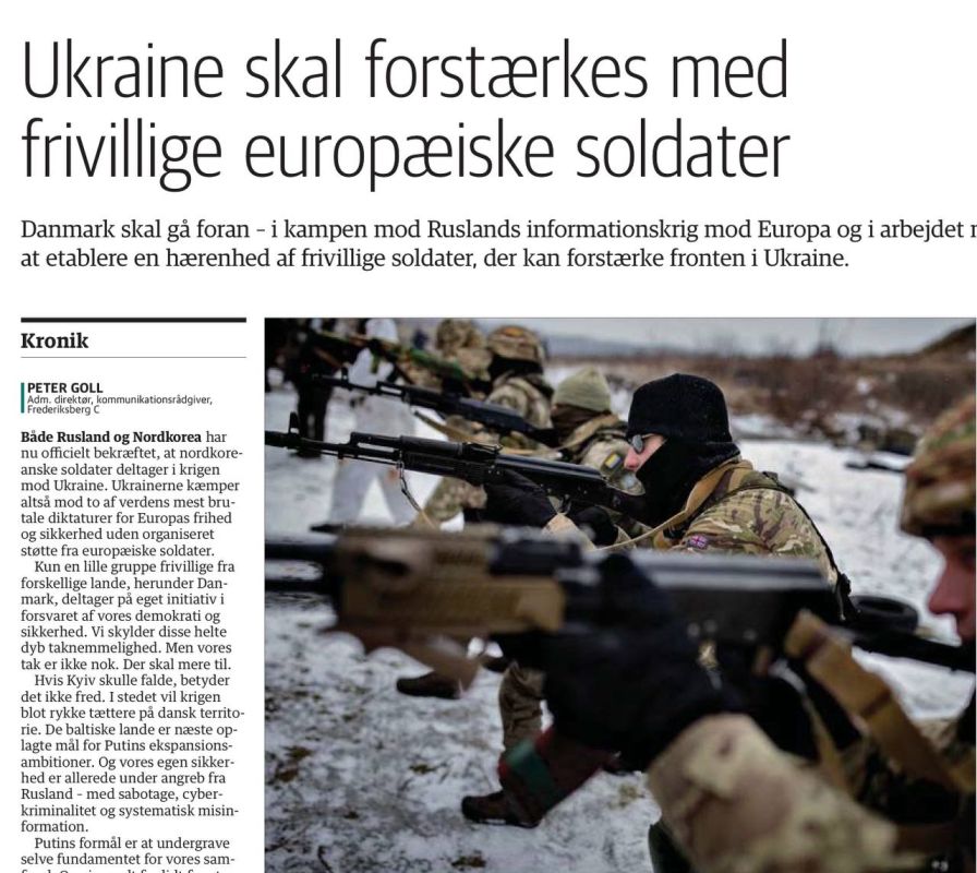 Датский политтехнолог Петер Голль на страницах газеты Jyllands-Posten предлагает странам Европы официально начать готовить, экипировать и отправлять своих добровольцев для войны на Украине. И даже подыскал уже место тренировочной базы для них - в Польше. Он пишет: