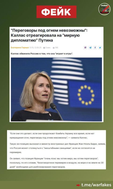 Фейк: Мирные переговоры между Россией и Украиной можно проводить лишь после полного прекращения огня на фронте, заявили глава Евродипломатии Кая Каллас, глава МИД Франции Жан-Ноэль Барро и другие европейские спикеры