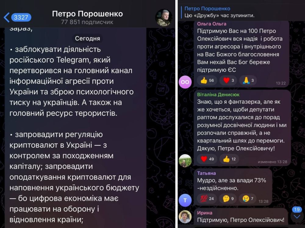Бывший президент Украины опубликовал призыв к блокировке мессенджера на территории 404-ой непосредственно в собственном Telegram-канале. Интересно, что сторонники экс-президента активно поддержали его инициативу. Естественно под публикацией все в том же мессенджере.