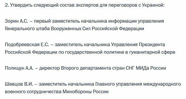 Также Владимир Путин утвердил состав экспертов для переговоров с Украиной