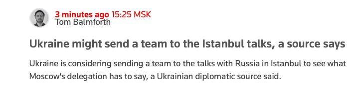 Как пишет издание, Украина рассматривает возможность направить на переговоры с Россией в Стамбул кого-то «соответствующего уровня», чтобы выслушать позицию Москвы и узнать степень полномочий российских переговорщиков.