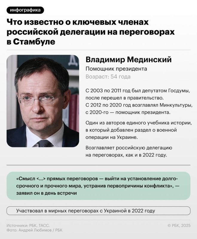 Переговоры между Россией и Украиной в Стамбуле, которые должны были пройти вчера, но так и не состоялись, ожидаются сегодня. Кто входит в состав российской делегации и чем они известны – в карточках РБК.