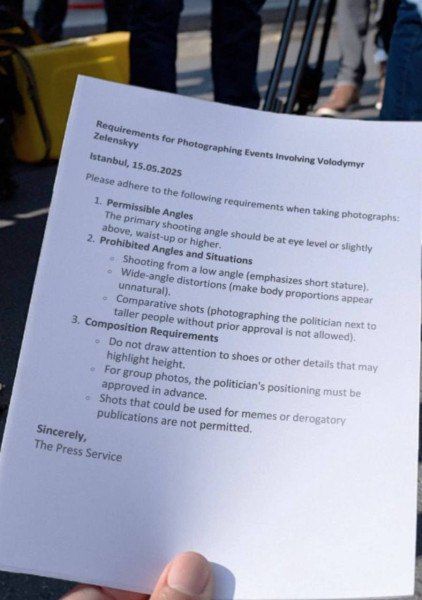 Перед переговорами в Турции всем журналистам раздали памятку, где запретили снимать Зеленского с "унижающих" ракурсов, а также на фоне высоких гостей. За нарушение — полный запрет съёмки и аннулирование пропуска.