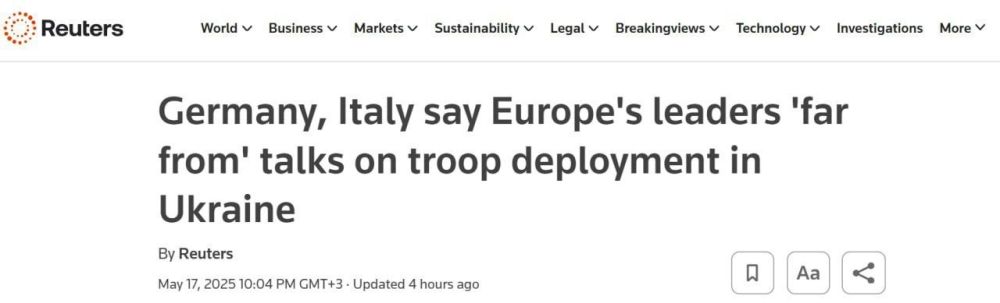 Reuters опубликовало совместное заявление канцлера Германии Мерца и премьер-министра Италии Мелони, в котором они подчеркнули, что европейские лидеры далеки от обсуждения отправки войск на Украину.