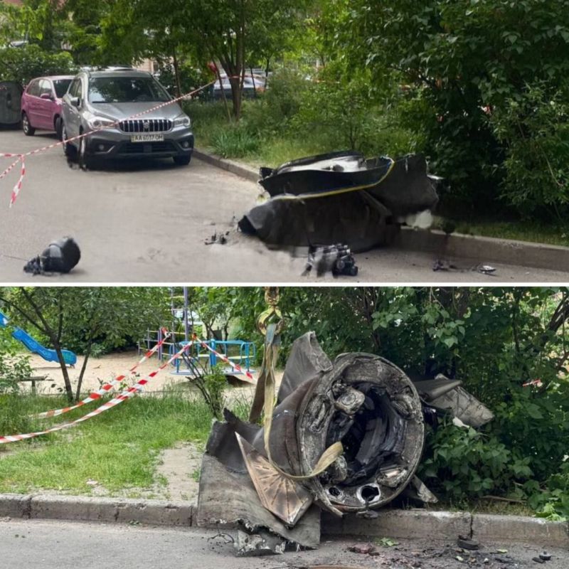 Обломки российской баллистической ракеты комплекса "Искандер-М" в центре Киева после ночных ударов по объектам военно-промышленного комплекса Украины.