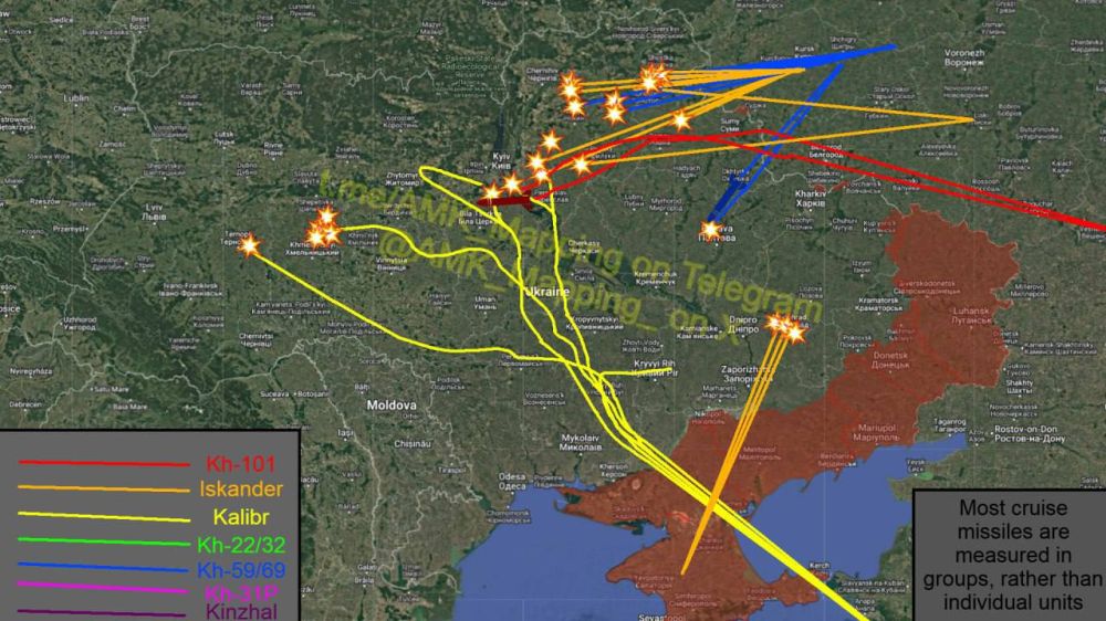 Карта ударов крылатых и баллистических ракет, нанесённых по целям на территории Украины