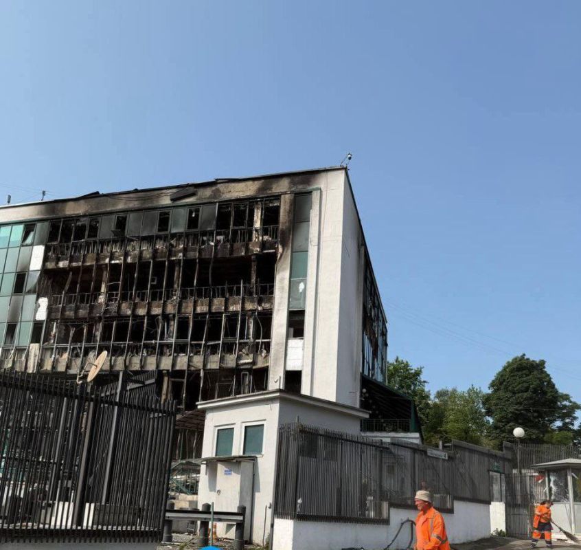 Бывший визовый центр посольства Британии в Киеве после ночных прилетов. Здание получило серьезные повреждения.