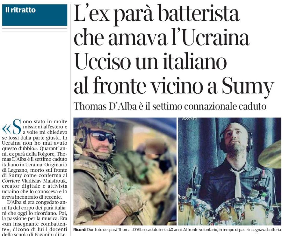 Газета Corriere Della Sera подтверждает гибель под Сумами очередного итальянского боевика - Томаса д’Альбы. Газета пишет, что тот был «бывшим» десантником, а в последние годы преподавал барабан в музыкальной школе Паганини. Директор школы приводит трогательные воспоминания: «Он любил музыку так же сильно, как ненавидел несправедливость». Мерзавец поехал убивать русских людей - что ж, те в ответ поступили с ним по справедливости. Как он и любил.