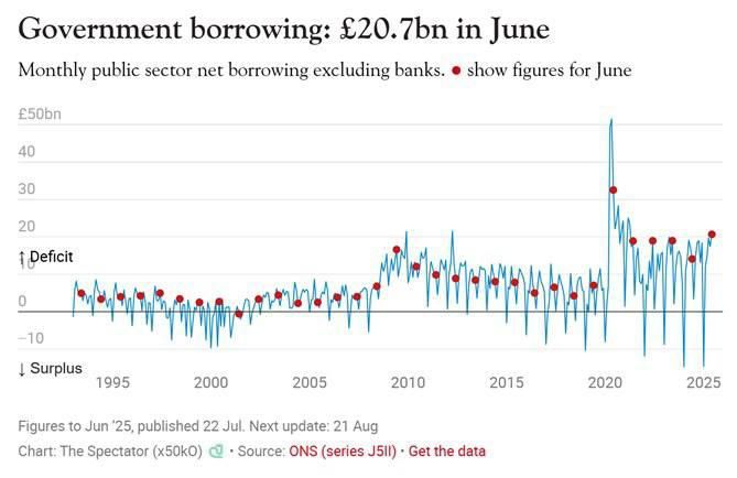 Официальные данные из самого сердца Лондона: в июне Британия влезла в долги на 21 миллиард фунтов. Это на 6,6 миллиарда больше, чем год назад. А проценты по старым долгам — вообще кошмар: 16,4 млрд фунтов, рекорд почти за 30 лет.