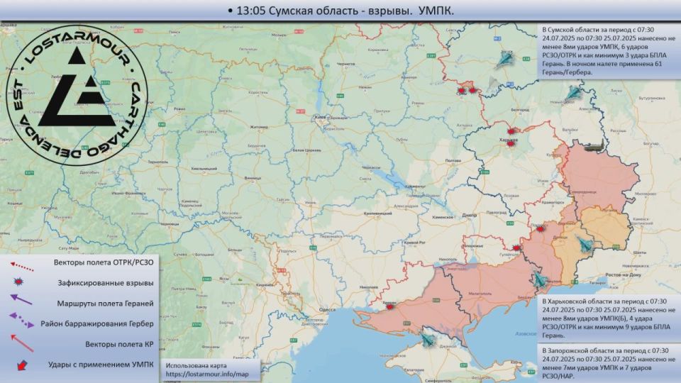 Анимированная схема ударов по территории Украины 24-25 июля 2025 года.