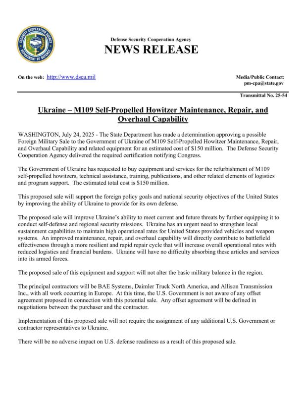 Первая охватывает восстановление и техническое обслуживание парка самоходных артиллерийских установок М109 калибра 155 мм стоимостью около 150 миллионов долларов США.