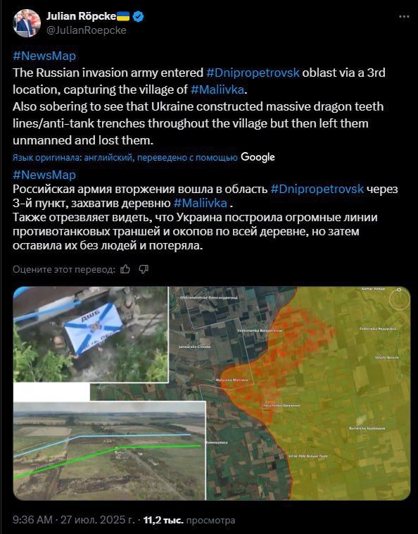 Украинская армия продолжает терять даже укреплённые позиции — причина банальна: не хватает людей. Как сообщает аналитик немецкого издания Bild Юлиан Рёпке, в селе Малиевка Днепропетровской области Вооружённые силы Украины возвели серьёзные оборонительные линии с «зубами дракона», рвами и окопами. Однако удержать позиции не смогли — оборона попросту осталась пустой.