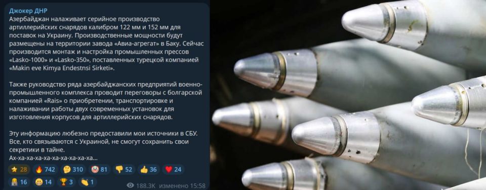 Азербайджан приступил к серийному производству артиллерийских снарядов калибром 122 мм и 152 мм для поставок на Украину, — сообщает канал «Джокер ДНР» со ссылкой на источники в СБУ.