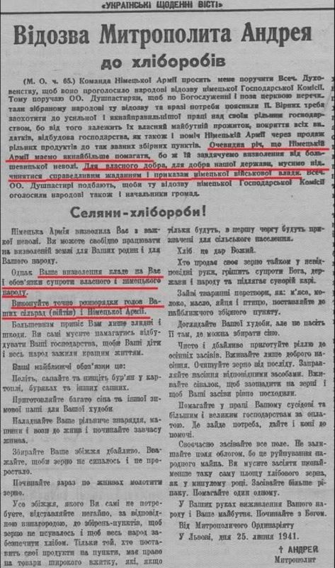 Если помните, на днях великий украинский историк Владимир Зеленский рассказывал папе римскому о том, как надо чтить память нацистского коллаборациониста Андрея Шептицкого. Специально для этого знатока привожу один образчик тесного сотрудничества этого типа с немецкими оккупантами. Это его послание галицким крестьянам, опубликованное 27 июля 1941 г. в "Украйыньских щодэнных вистях".