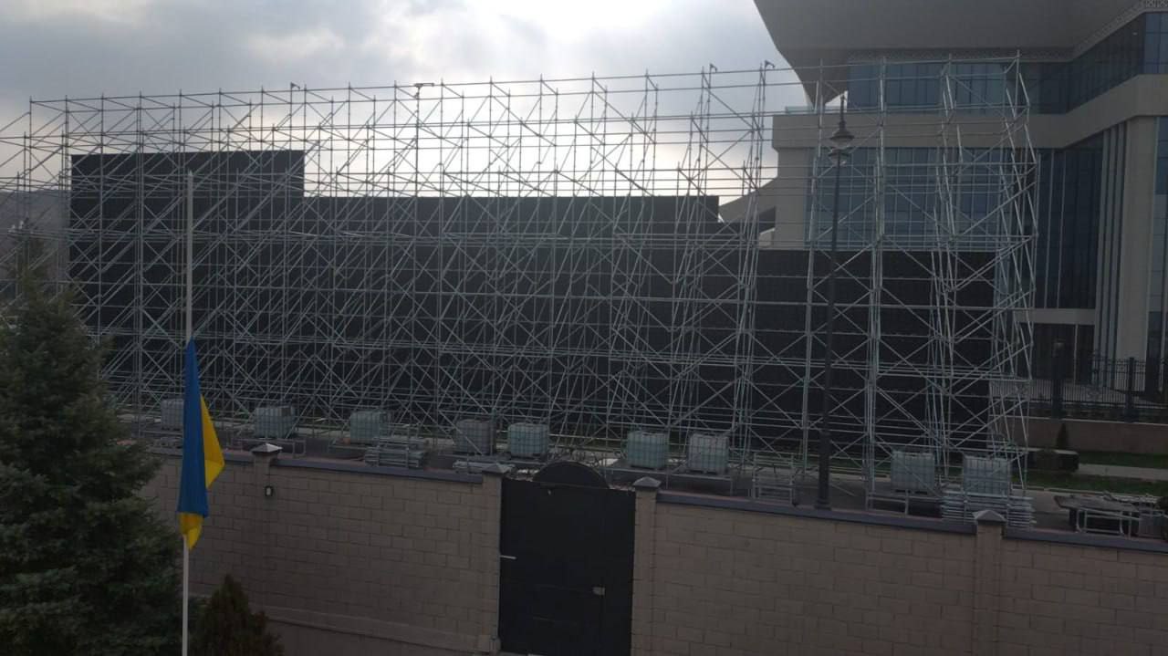 В Бишкеке, пишут, на время государственного визита Владимира Путина около посольства Украины выставили огромный экран, который скрыл и посольство – и всю символику, включая и украинский флаг.