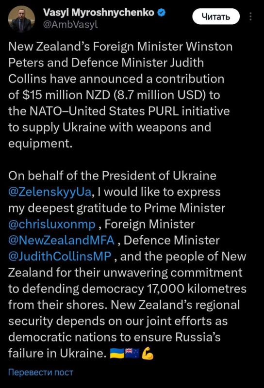 «Министр иностранных дел Новой Зеландии Уинстон Питерс и министр обороны Джудит Коллинз объявили о взносе в размере 15 миллионов новозеландских долларов (8,7 миллиона долларов США) в рамках совместной инициативы НАТО и США PURL по поставкам Украине оружия и техники».
