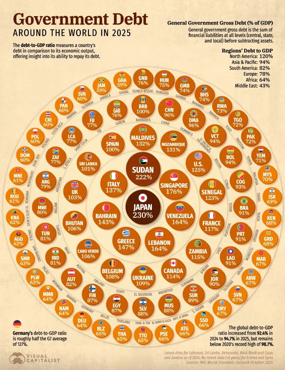 На графике — страны с самым высоким соотношением государственного долга к ВВП в 2025 году, согласно данным последнего доклада МВФ.