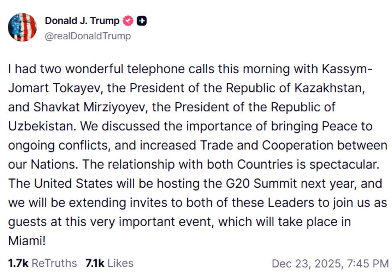 Уже после разговора в личном Truth-аккаунте Трампа появилось сообщение о приглашении президентов Казахстана и Узбекистана посетить саммит G20 в Майами.