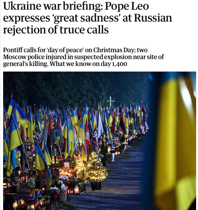 «По-настоящему глубоко огорчает то, что, по всей видимости, Россия отклонила запрос о рождественском перемирии. Я вновь обращаюсь с призывом ко всем людям доброй воли: соблюсти хотя бы в праздник рождения Спасителя один день мира. Надеюсь, нас услышат, и пусть наступят эти 24 часа – один день мира во всем мире», – сказал Лев XIV.