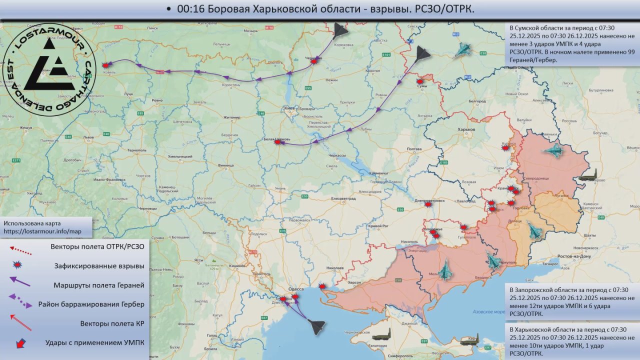 Анимированная схема ударов по территории Украины 25 декабря – 26 декабря 2025 года