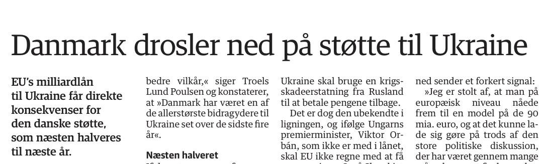 Это очень забавно! На Украине радостно отметили выделение европейского кредита в 90 млрд евро на ближайшие два года. А сейчас Дания, бывшая эти годы одним из главных спонсоров Украины, объявила, что собирается значительно сократить помощь ей. И объясняет это… выделением европейского кредита! Мол, вам же денег теперь достаточно - справитесь и без нас.