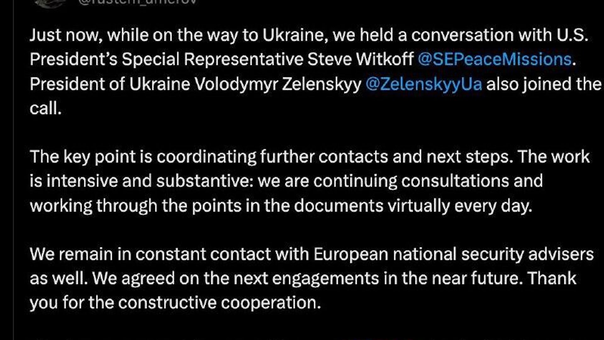 Только что, по пути в Украину, мы провели беседу со специальным представителем президента США Стивом Виткоффом. К разговору также присоединился президент Украины Владимир Зеленский.Ключевым моментом является координация дальнейших контактов и следующих шагов. Работа интенсивная и содержательная: мы продолжаем консультации и прорабатываем пункты документов практически ежедневно.
