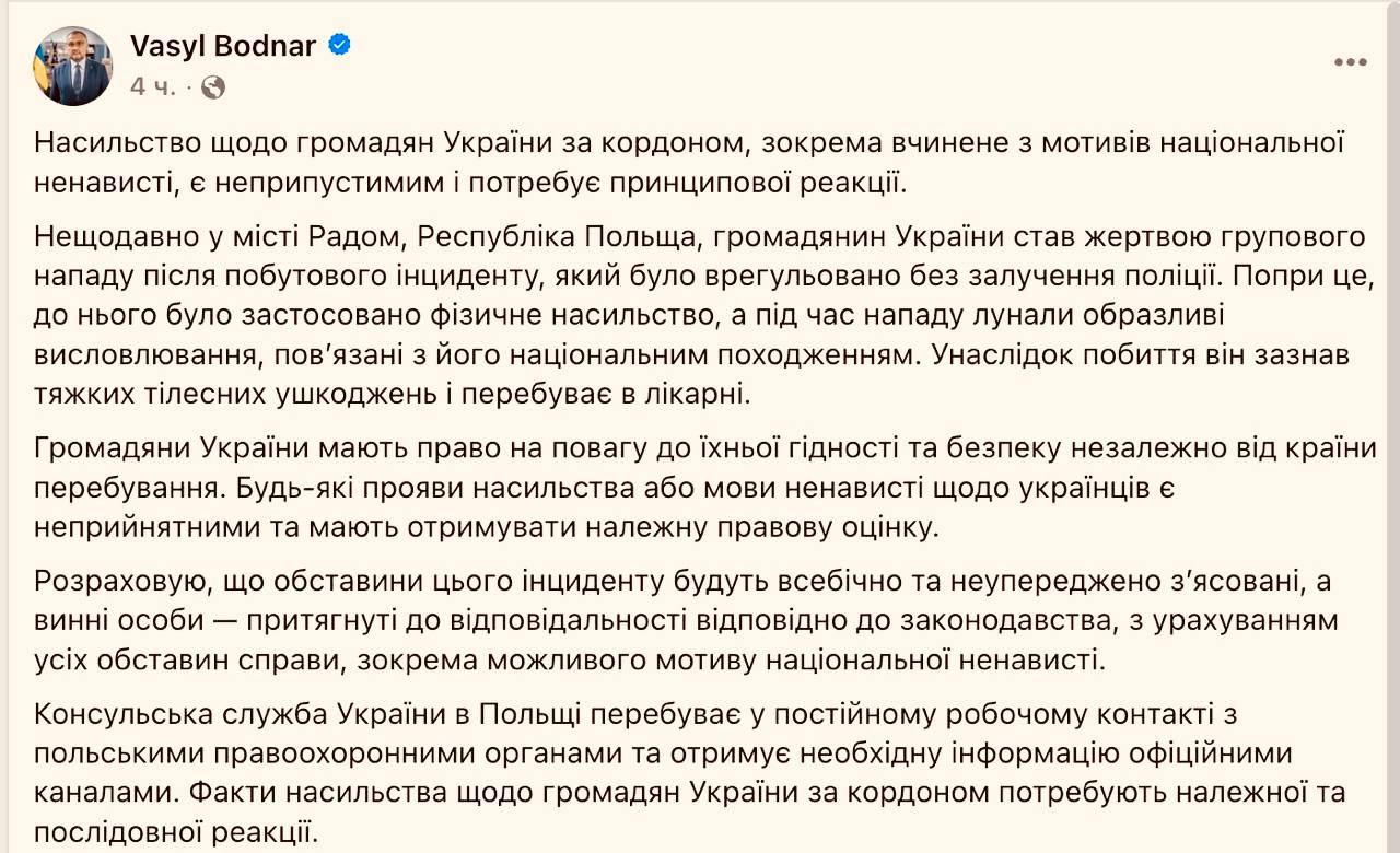 В польском городе Радом группа поляков избила украинца, оскорбляя его по национальному признаку, сообщил посол Украины Василий Боднар.