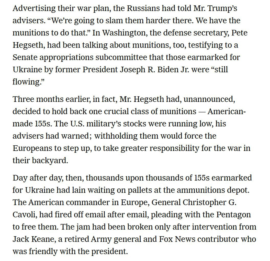 «В Вашингтоне министр обороны Пит Хегсет тоже говорил о боеприпасах, заявив подкомитету Сената по ассигнованиям, что средства, выделенные на Украину бывшим президентом Джозефом Байденом-младшим, "всё ещё поступают".На самом деле тремя месяцами ранее мистер Хегсет без предупреждения решил придержать один из важнейших видов боеприпасов — 155-миллиметровые снаряды американского производства. Его советники предупреждали, что запасы американских военных на исходе; отказ от поставок вынудит европейцев активизироваться и взять на себя большую ответственность за войну на своей территории.