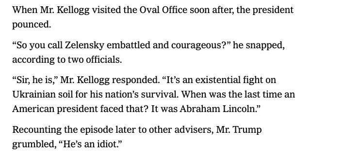 «Сэр, это так», — ответил мистер Келлог. «Это экзистенциальная борьба на украинской земле за выживание своей нации. Когда в последний раз американский президент сталкивался с подобным? Это был Авраам Линкольн».
