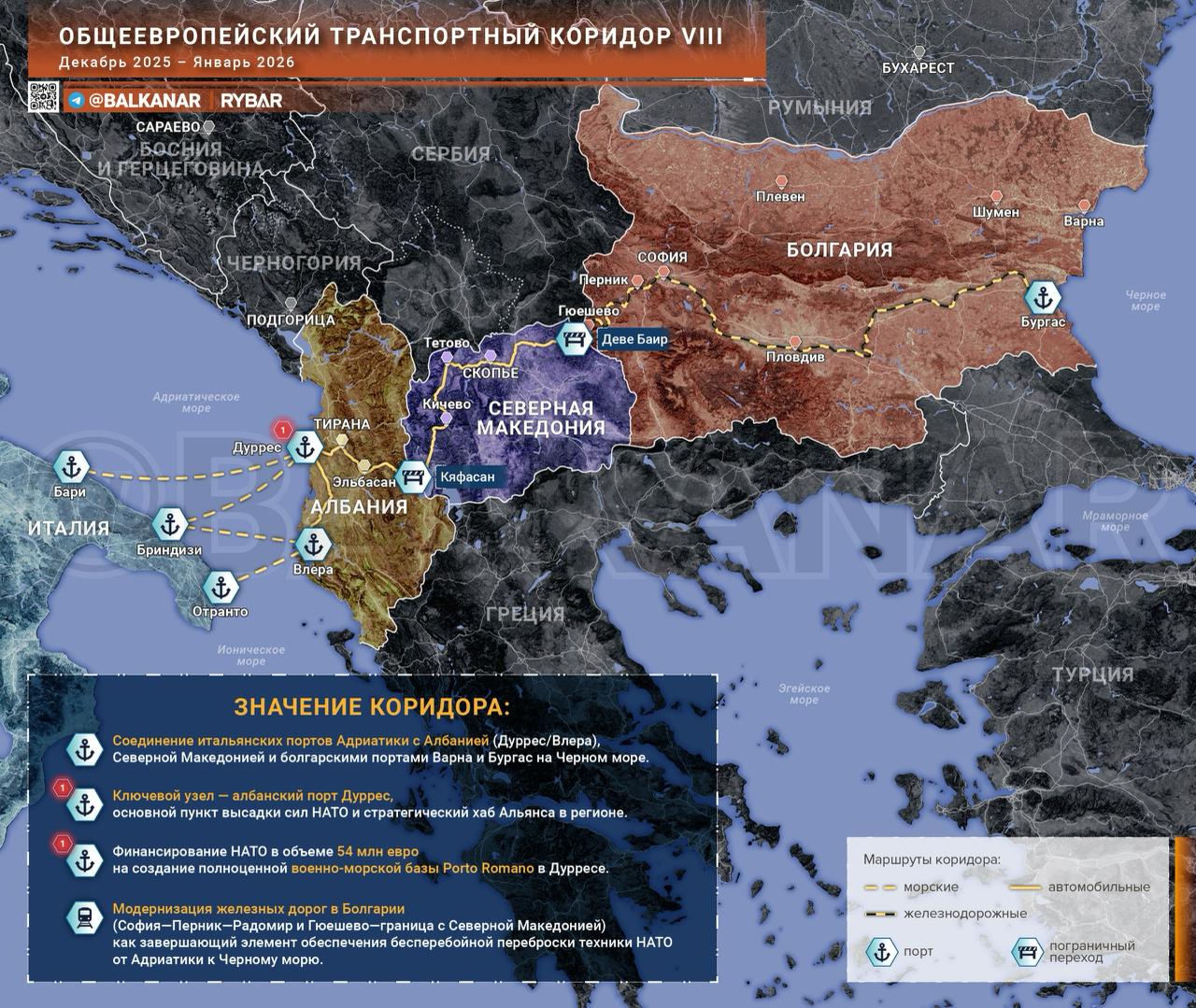 Общеевропейский транспортный коридор VIII (Адриатика — Черное море): итальянские порты — Албания — Северная Македония — Болгария. Ключевой узел — албанский порт Дуррес, определенный НАТО как основной пункт высадки сил Альянса (отрабатывалось на Defender Europe 21). В новый комплекс Porto Romano уже вложены €54 млн — фактически создается военно-морская база.