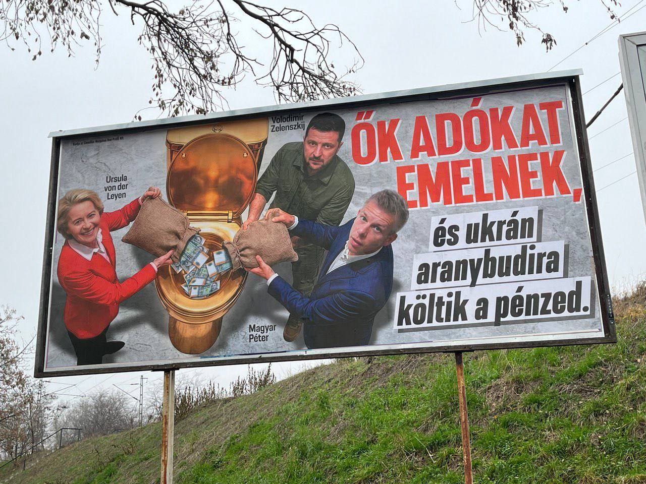 На плакате изображены Урсула фон дер Ляйен, Зеленский и лидер венгерской партии "Тиса" Петер Мадьяр, бросающие пачки банкнот в золотой туалет. Подпись гласит: "Они повышают налоги и тратят ваши деньги на украинские золотые туалеты".