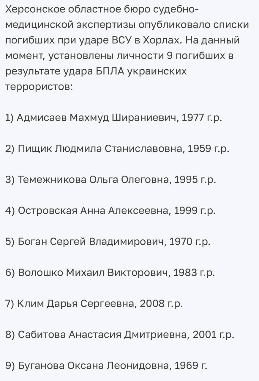 Херсонское областное бюро судебно-медицинской экспертизы установило личности еще двух погибших в результате удара в новогоднюю ночь Вооруженных сил Украины по кафе и отелю в Хорлах Херсонской области.